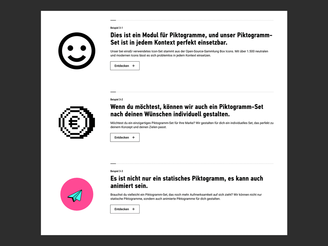 Dies ist unsere offizielle einser-Präsentations-Website – sie wurde ebenfalls mit unserem Modul-System erstellt. Hier zeigen wir dir in aller Ausführlichkeit, welche vielfältigen Möglichkeiten dir unsere einser-Module bieten.